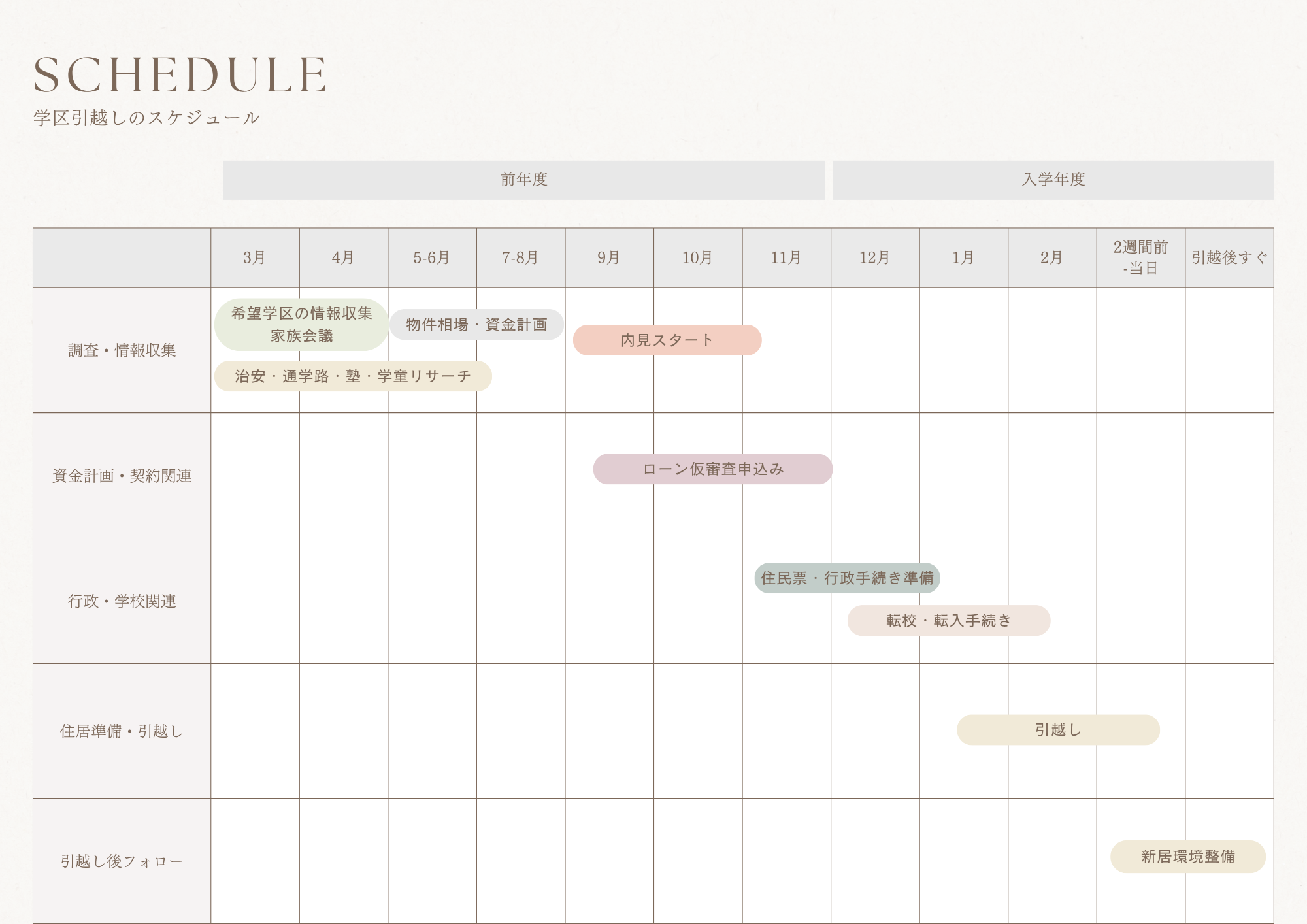 4〜3ヶ月前 | 学区・エリア決定(誠之小、昭和小など)/物件探しスタート |